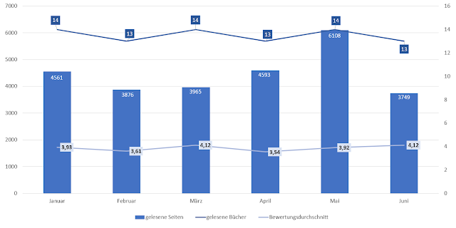 Im Juni sind es wieder 13 Bücher geworden. Erst beim Erstellen der Übersichtsgrafik für 2025 ist mir aufgefallen, dass ich dieses Jahr seit Januar bisher jeden Monat abwechselnd 14 und dann 13 Bücher gelesen habe - und zwar immer dann, wenn der Monat 31 Tage hatte. Wie seltsam zyklisch ist das denn bitte?!?! Mit 3749 Seiten sind es ein paar weniger gelesene Seiten geworden, da ich ein Kinderbuch und drei recht kurze Novellen gelesen habe. Alle gelesenen Titel verteilen sich auf 4 Prints, 5 Ebooks und 4 Hörbücher, von denen insgesamt sechs Bücher auf englischer Sprache waren.